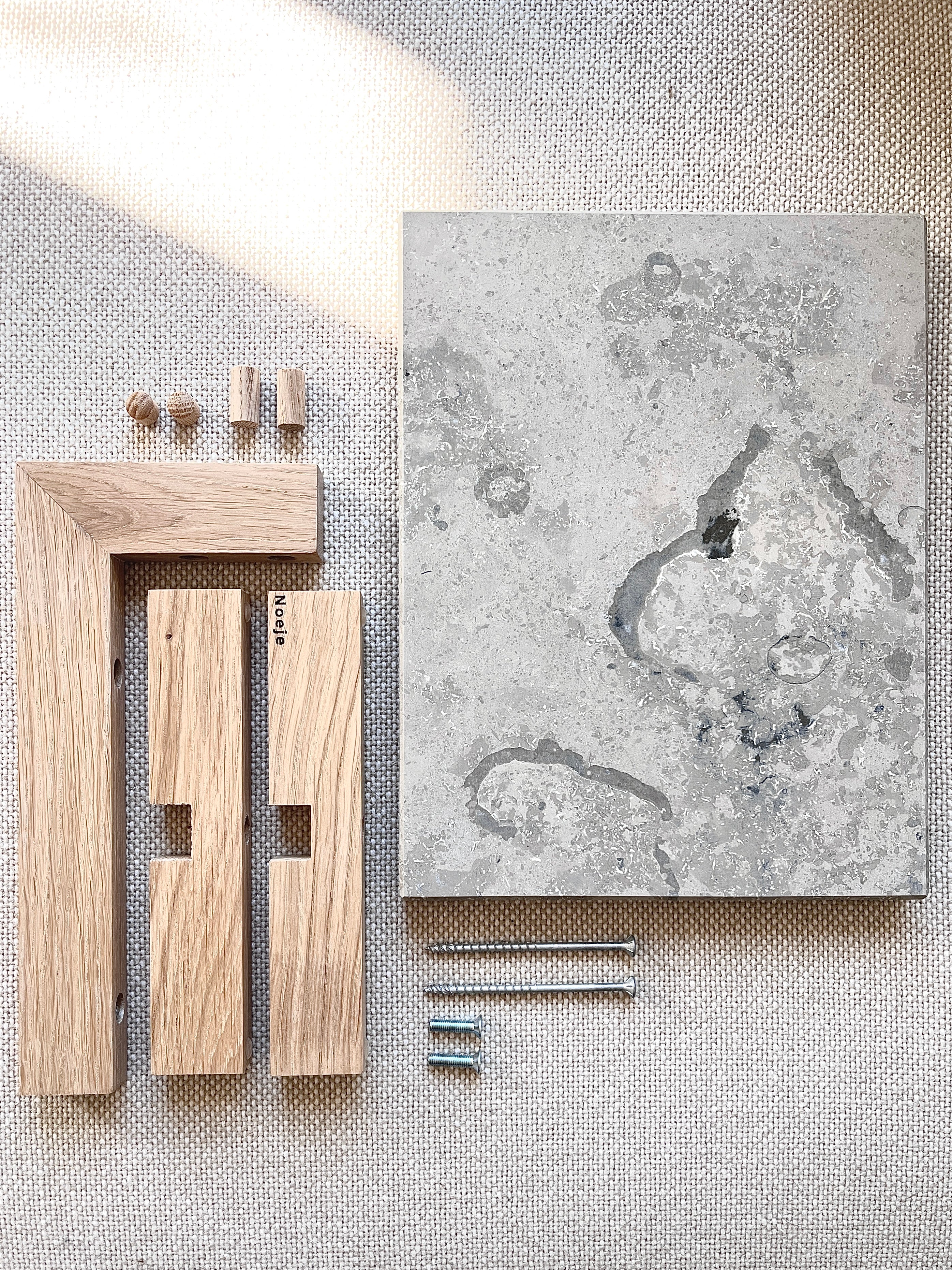 Da både sten og træ er naturlige og udvalgt fra overskudsmaterialer, er hver TRIBUT Hylde helt unik. Stenens mønster og træets struktur varierer, hvilket gør hver hylde til et særligt stykke design.